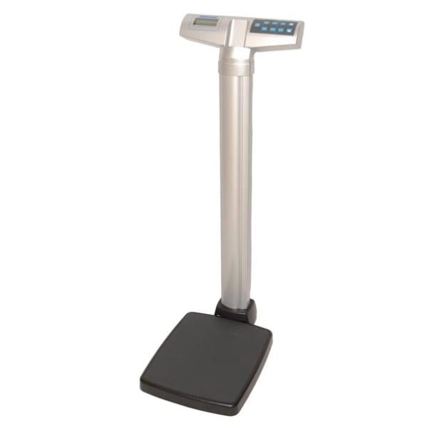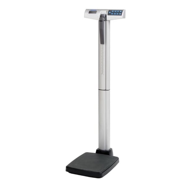 <p>Large, low platform with non-skid mat for stability and easy access. Has an easy-read, 1" high LCD readout, user friendly interface features such as BMI (easy scroll method), Hold/Release, Zero, KG/LB, Clear & Enter functions, Auto-Zero, 2 minute Auto-Off (AC mode disabled), low battery indicator. Includes a strong aluminum pillar, EMR Connectivity via USB Port and (6) AA-cell batteries or 120V AC adapter. 2-year limited warranty.</p>