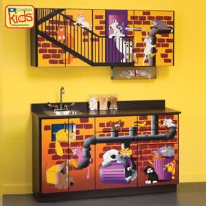 Pre-assembled units save time. Easy-clean all laminate construction. All graphics are permanently embedded in the high pressure laminate and will not peel off. Tough, clip-resistant PVC edges. Assembled with steel fasteners. Four adjustable leveling feet on each unit. Three-way adjustable 110° hinges. Euro-style drawer fronts with metal sides that hold up to 75 lbs. Recessed toe kick. Easy hook and rail wall installation. Slate Gray edgebanding on all edges. Black chrome door/drawer pulls. Easily removes for relocation. Drawers can be added to any base unit. Doors and drawer can be moved to accommodate sinks.