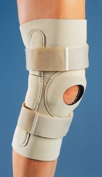 Compressive neoprene knee support is available with and without buttress. Universal buttress may be adjusted to allow for medial, lateral, inferior, or superior patella stabilization. Sturdy removable dual axis hinges and superior/inferior contact closure straps provide medial/lateral ligament support. Ideal for moderate medial/lateral knee instability, mild ACL/PCL sprain, osteoarthritis, patellofemoral dysfunction.