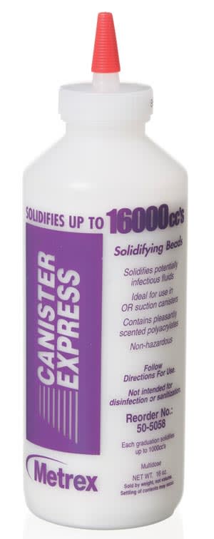 Solidifies liquid medical waste in collection vessels, such as suction canisters. Protects healthcare workers and promotes workplace safety. Eliminates spilling, splashing and aerosolizing of liquid medical waste.
